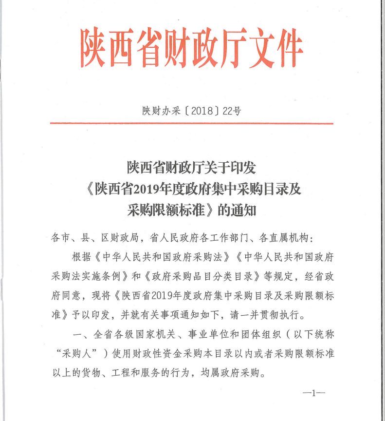 陜西省財政廳關于印發《陜西省2019年度政府集中采購目錄及采購限額標準》的通知