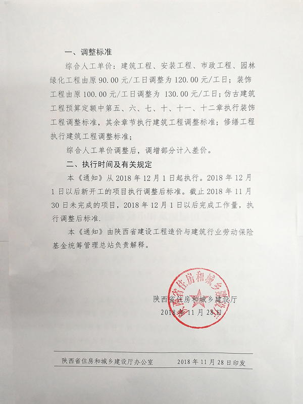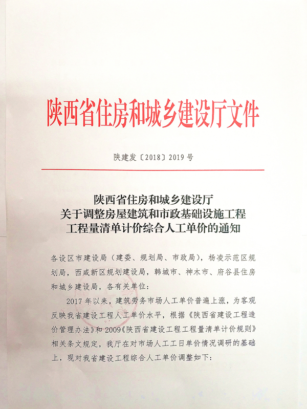 陜建發(2018)2019號-關于調整房屋建筑和市政基礎設施工程工程量清單計價綜合人工單價的通知