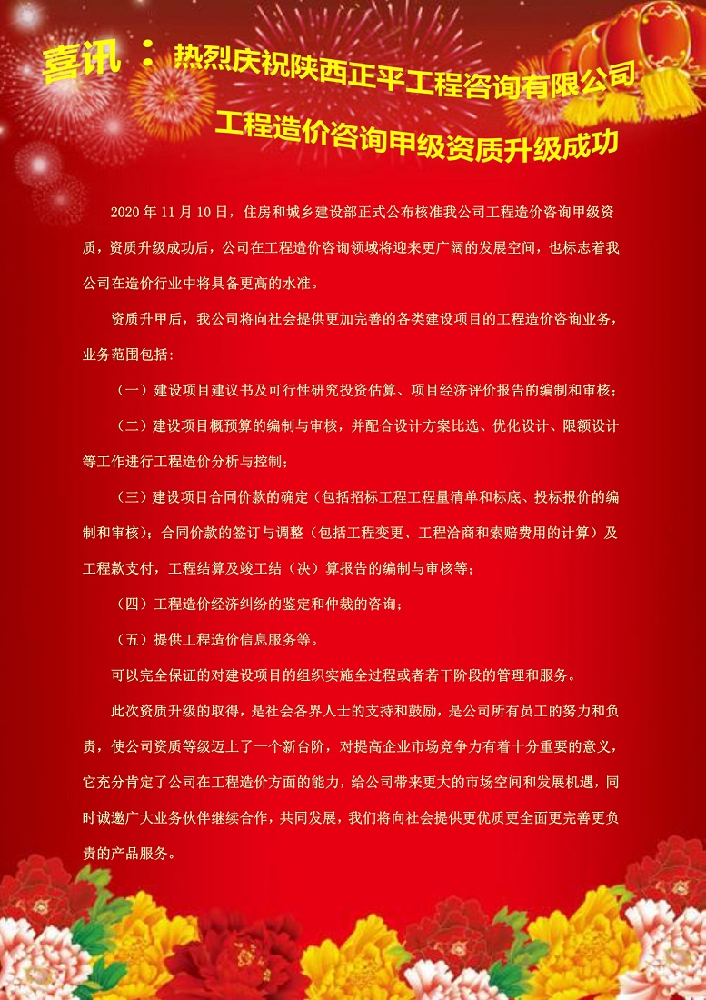 喜訊:熱烈慶祝陜西正平工程咨詢有限公司工程造價咨詢甲級資質升級成功