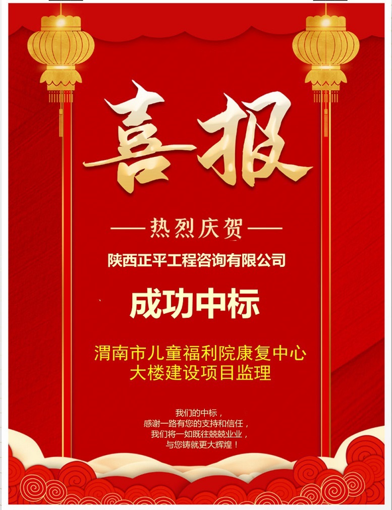 2021年7月9日,我公司參與“渭南市兒童福利院康復中心大樓建設項目監理”投標開標,在2021年7月30日領取中標通知書,中標金額121萬元。在此,我們對為該項目的投標付出辛勤努力的各位領導和同志們表示衷心的感謝!恭賀公司監理部取得新的監理項目!希望我們的項目監理班子再接再厲,按照規范、標準落實自己的責任。