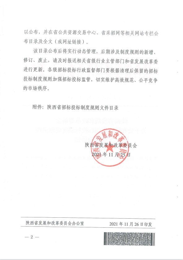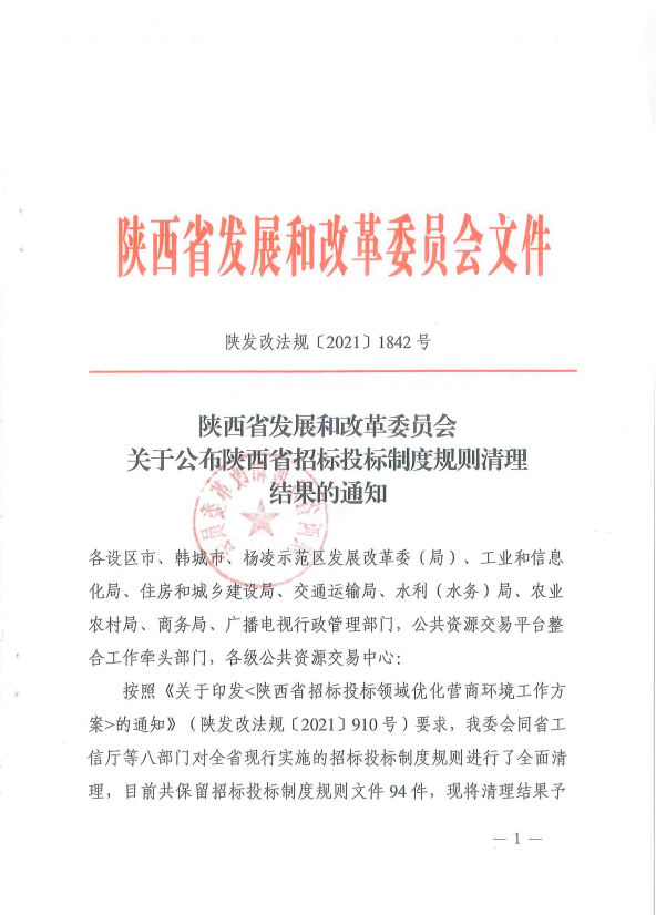 陜發改法規(2021)1842號 陜西省發改委關于公布陜西省招投標制度規則清理結果的通知