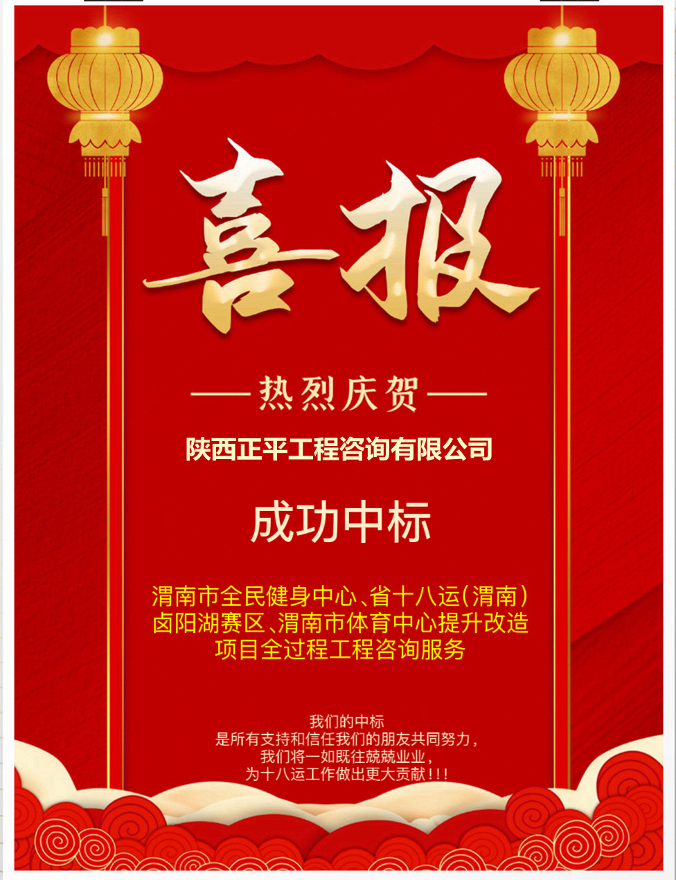 2023年12月13日,我公司參與“渭南市全民健身中心、省十八運(渭南)鹵陽湖賽區、渭南市體育中心提升改造項目全過程工程咨詢服務”投標開標,在2024年1月2日領取中標通知書。在此,我們對為該項目的投標付出辛勤努力的各位領導和同志們表示衷心的感謝!恭賀公司取得新的全過程工程咨詢服務項目!希望我們的全過程咨詢全體同仁再接再厲,按照規范、標準、規劃落實自己的責任。